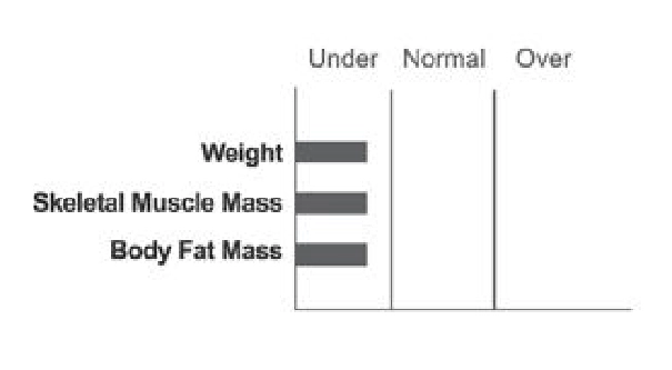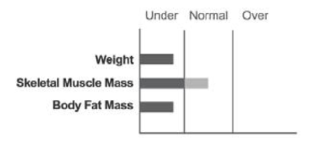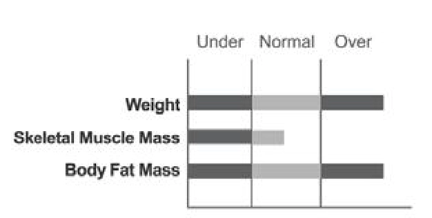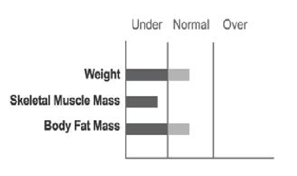 El peso del sujeto está dentro del rango normal y no es obeso., pero su composición corporal no es la ideal. Las personas con este tipo de composición corporal deberían hacer ejercicio para conseguir la forma corporal ideal., sin tener que bajar de peso, deberían ganar masa muscular esquelética.